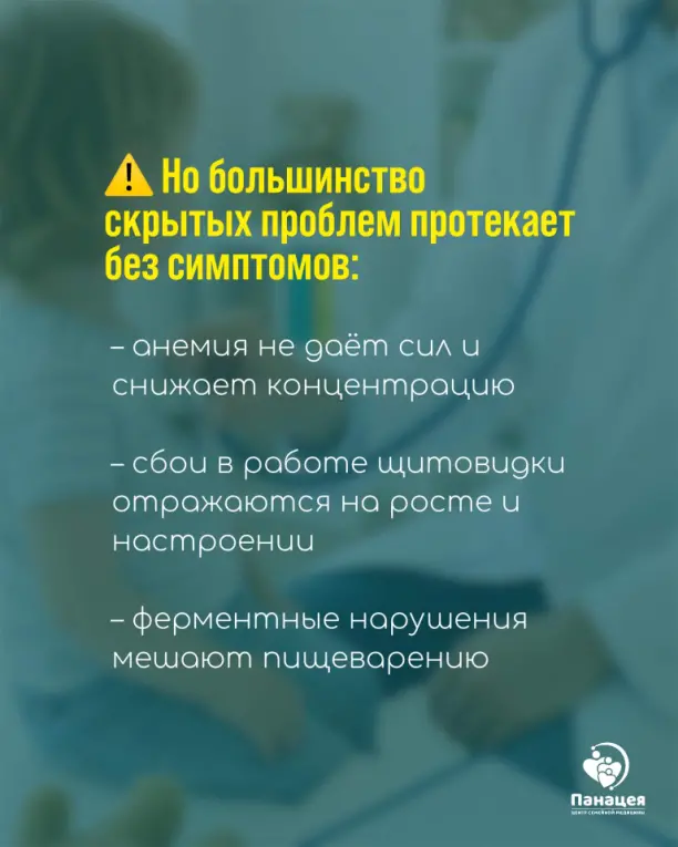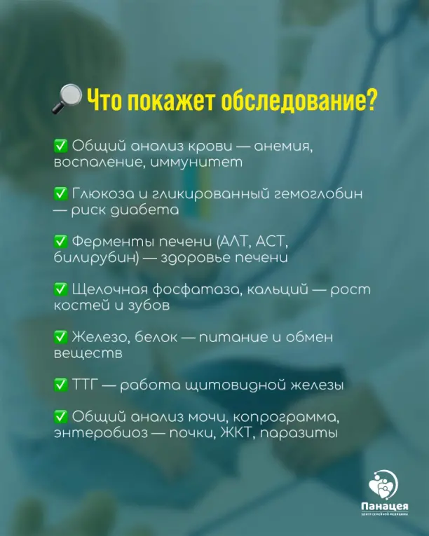 Широкий комплекс лабораторных исследований для оценки состояния здоровья ребёнка и выявления скрытых заболеваний.