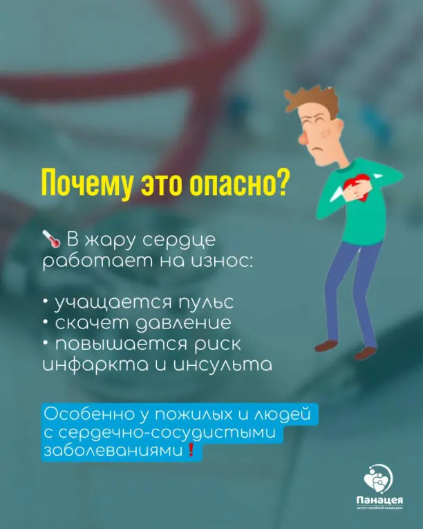 Когда температура поднимается выше +30°C, сердце работает на износ: 🔺 учащается пульс 🔺 падает давление 🔺 возрастает риск инфаркта и инсульта