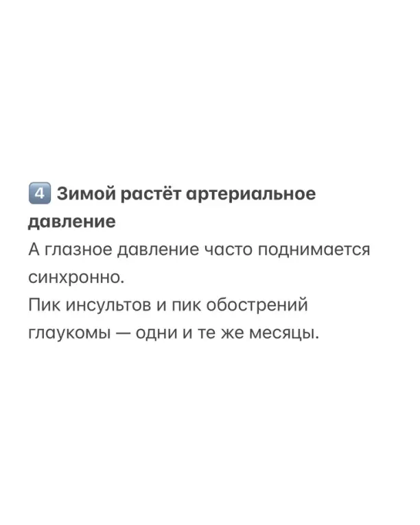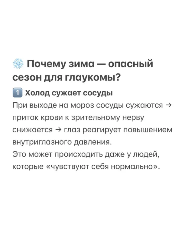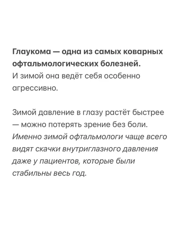 Зимой офтальмологи фиксируют максимальное количество скачков внутриглазного давления — даже у тех пациентов, которые весь год были стабильны и чувствовали себя хорошо. Часто человек даже не подозревает, что зрение уже под угрозой.
