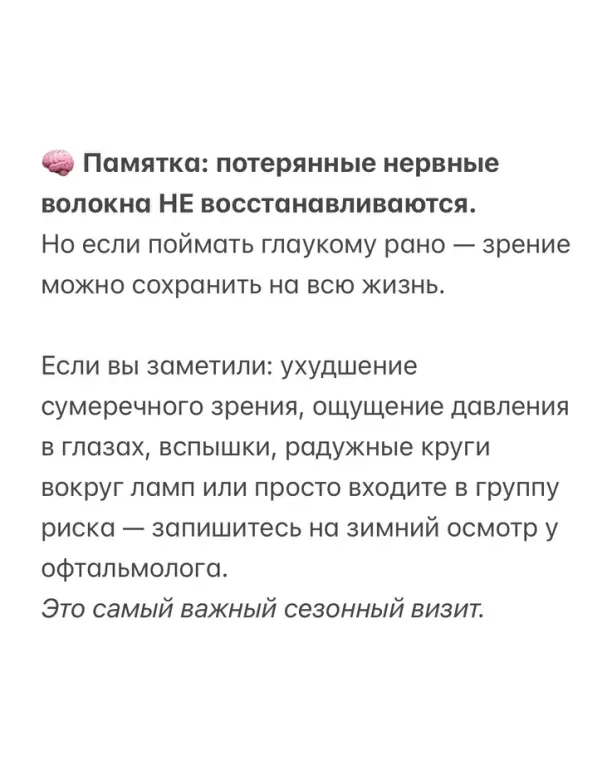 Потому что в этот сезон глаукома проявляет себя сильнее всего, и врач может увидеть то, что «прячется» в стабильный период. Это повышает шанс выявить болезнь на ранней стадии, когда зрительный нерв ещё можно защитить.