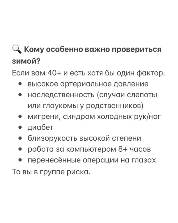 💡 Если вам 40+ или есть факторы риска, зима — лучшее время для проверки: именно сейчас можно поймать скрытые изменения, которые в другое время года остаются незаметными.