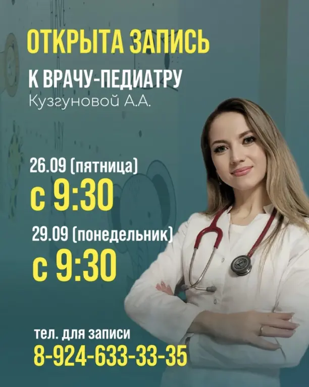 Открыта запись к врачу-педиатру Кузгуновой А.А.: