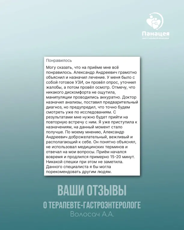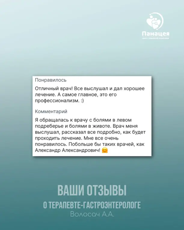 Если вас беспокоят боли в животе, изжога, вздутие, нарушение стула или другие проблемы с пищеварением, не игнорируйте симптомы! Опытный врач-гастроэнтеролог Волосач Александр Андреевич поможет разобраться в причине недомоганий и подобрать эффективное лечение.